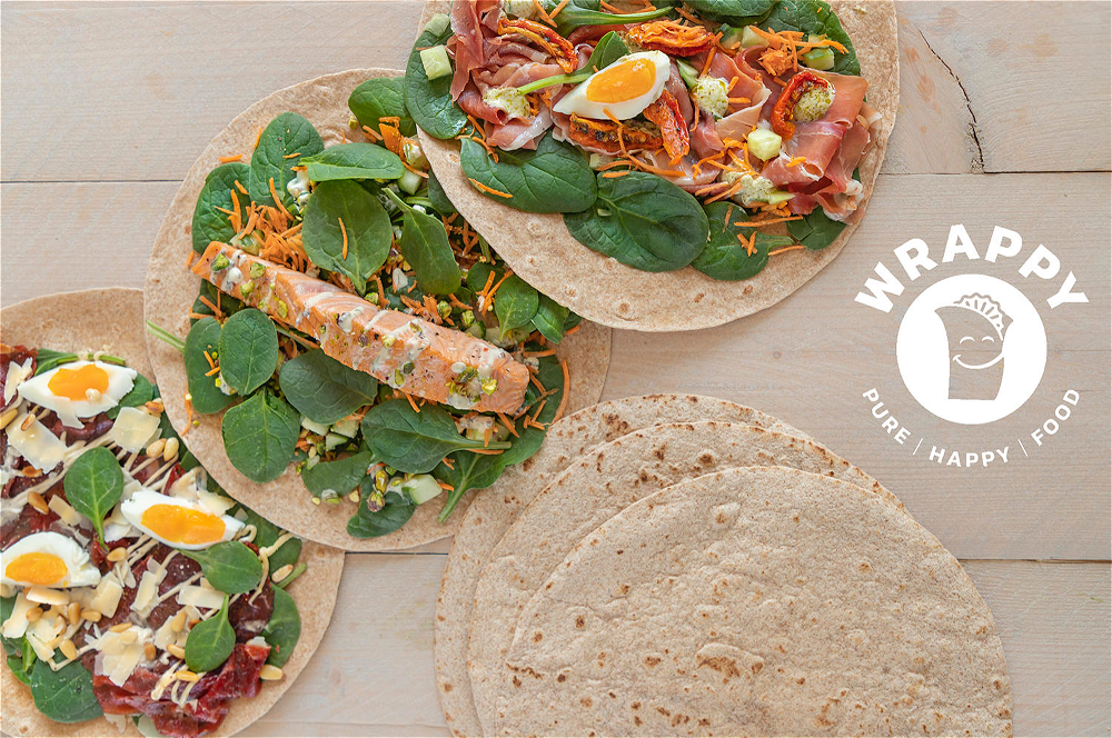 Wrappy's gekruid kipgehakt | Chili-mayo | Mango | Gefrituurde uitjes | Augurk | Radijs | Kokoschips | Gepocheerd ei | Wortel | Komkommer | Volkoren pasta